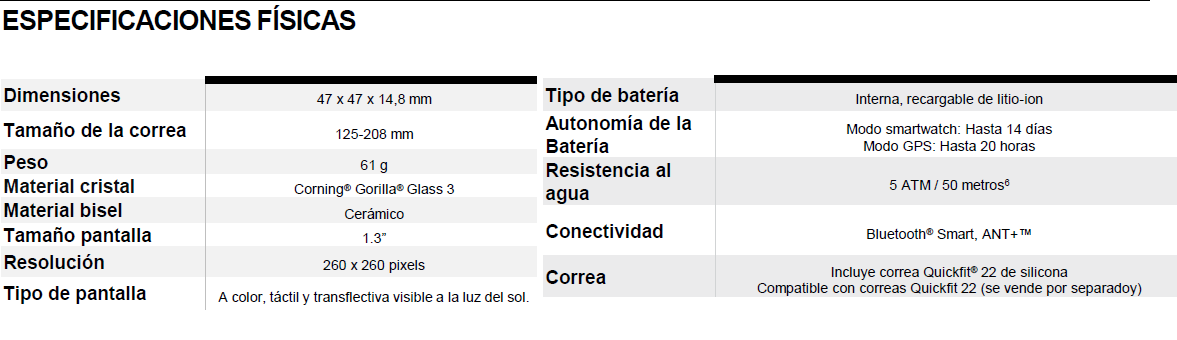 BATERÍA. La batería recargable dura hasta 20 horas con GPS y hasta 14 días en modo smartwatch.