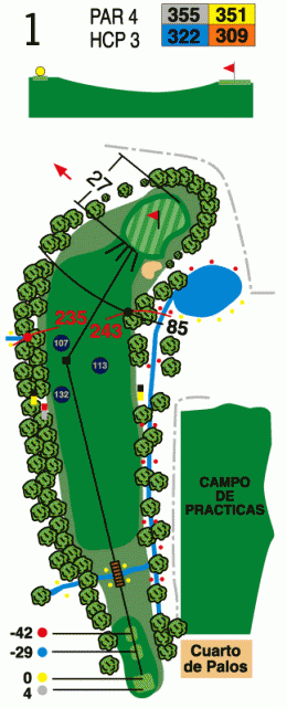 Hoyo no excesivamente largo, con "dog-leg" a la derecha, a la caída del driver. Se encuentra delimitado por un "out" en su parte derecha, y otro "out" al fondo del green.