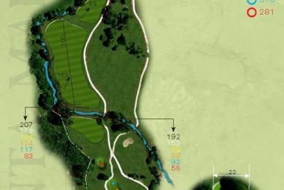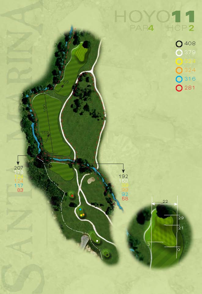 Salida en alto hacia una calle con un dogleg hacia la derecha. El golpe de salida deberá poyarse por el lado izquierdo. Un enorme hazard recorre todo el lado derecho de la calle.