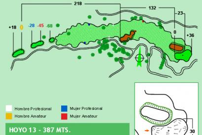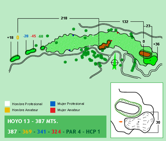 Un hoyo magnífico, que tiene varios obstáculos que condicionan la estrategia del driver. Dos robles situados en la calle por el lado izquierdo y un bosque de robles por el derecho estrechan considerablemente el pasillo de juego. Con el green situado varios metros más alto, debemos tener especial cuidado para atacar la entrada con el palo correcto, dado que la valoración de la distancia al objetivo puede cambiar drásticamente según la posición de la bandera.