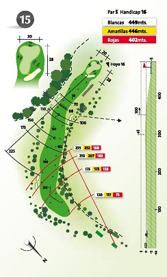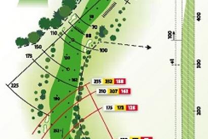 La caída del drive está marcada por dos grandes bunkers. Dogleg hacia la derecha, que tienta a los pegadores.