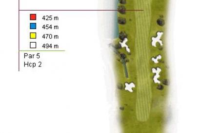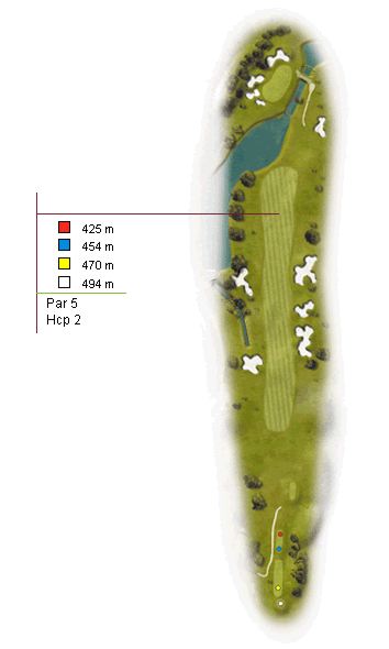 Par 5 de 494 metros con un green protegido por agua frontal y lateral. Los handicaps más bajos pueden intentar jugar a green de dos golpes, pero lo más recomendable será aproximarnos al lago y buscar la bandera con un hierro corto. Para firmar un buen resultado en este hoyo, sólo quedará ser bueno con el putter sobre un green ondulado con 32 metros de largo.