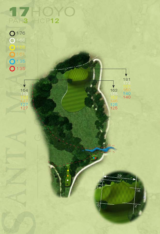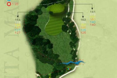 El tee en alto está rodeado de árboles y arbustos. El green es grande y cuenta con dos pianos por lo que para asegurarse el par deberá acertar con el palo y colocar la bola en el lado correcto de green.