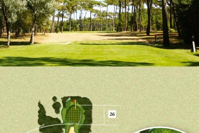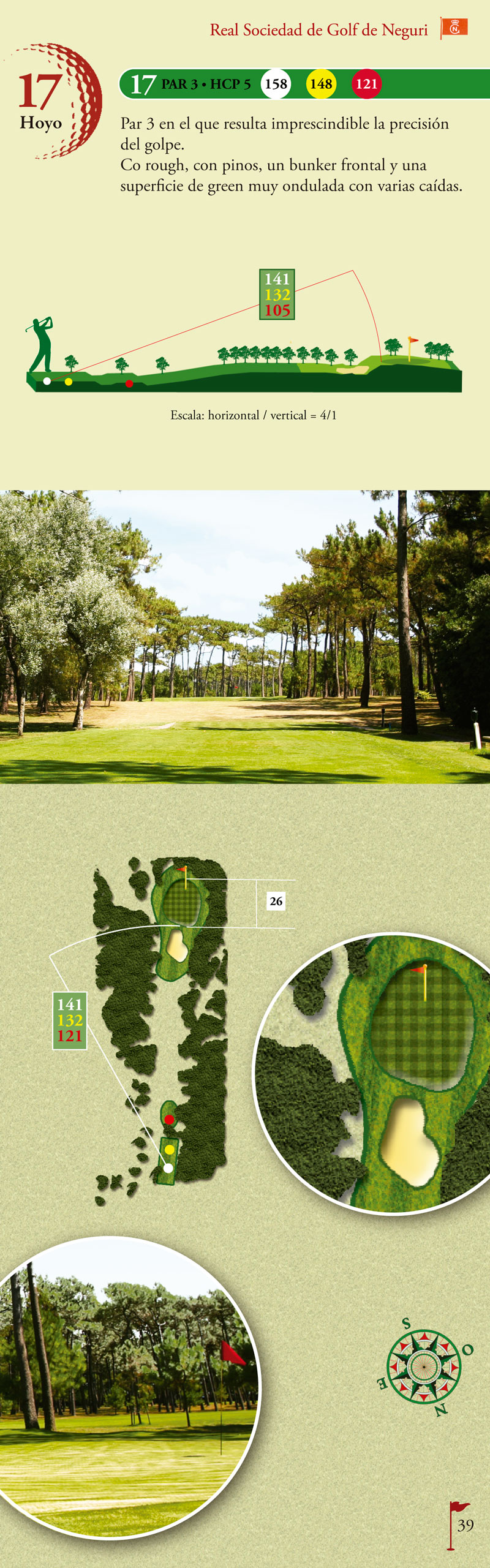 Par 3 en el que resulta imprescindible la precisión del golpe. Con rough, pinos, un bunker frontal y una superficie de green ondulada con varias caídas.