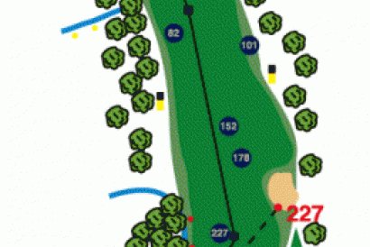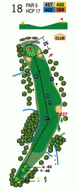 Par 5 para acabar el recorrido. salida con dog-lej a la izquierda, segundo golpe en subida divisando el Green y la casa Club. Green protegido por 2 bunquers. Salida con Driver, los grandes pegadores arrisegan la salida por encima de los arboles, para acortar el hoyo. Segundo golpe con madera 3 o 5, para despues acometer el green con un aproach corto.