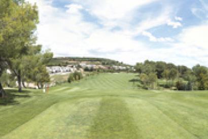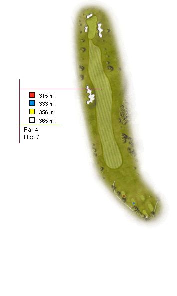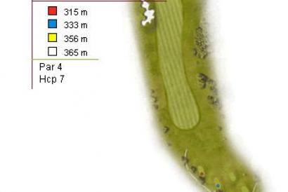Desde el tee podemos adivinar como se trata de unos de los hoyos más complicados del campo. Ligero dog-leg a diestras con fuera de limites a la izquierda y un incómodo bosque de pinos a la derecha.