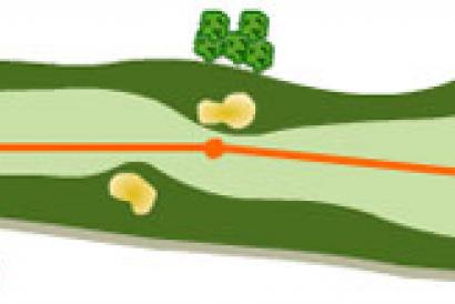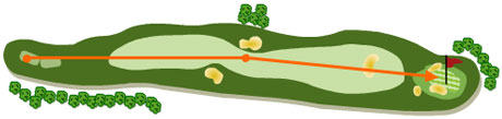 El segundo golpe es problemático, dado que tenemos un bunker en el centro de la calle y tendremos que decidir si jugar corto o pasar el bunker. El green está alto y protegido por bunkers a ambos lados, que añaden dificultad al golpe de aproach.