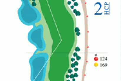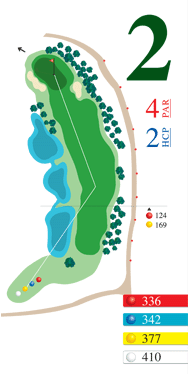 Agua a la izquierda. El handicap alto debera jugar por la derecha en salida. El handicap bajo deberá sobrevolar el primer lago. Apoyar tiro a green por la derecha.