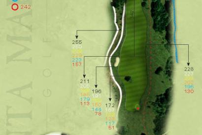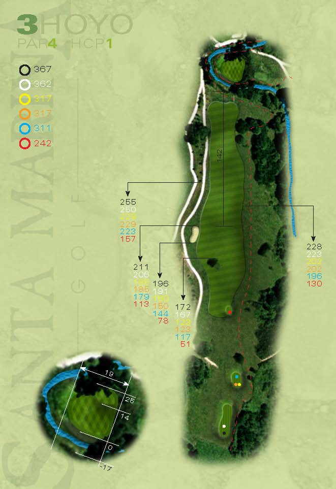 Par 4 cuesta abajo. La línea de juego desde el tee es justo por encima del árbol situado en la calle. La gran dificultad del hoyo reside en el espectacular tiro al green, el cual está protegido por un arroyo que lo bordea por la parte frontal, izquierda y posterior. Los frondosos árboles y arbustos que rodean al green dan la sensación de no tener margen de error.