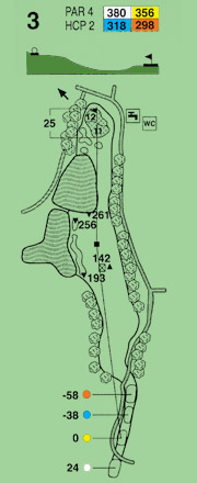 Estrecho y serpenteante bunker a la izquierda en la caída del driver, protege la bola de acabar en el obstáculo de agua. Es fundamental no perder la calle en la salida. El segundo golpe resulta complicado al tener agua frontal y green en alto, protegido en la parte delantera por tres profundos bunkers. Green terrorífico.