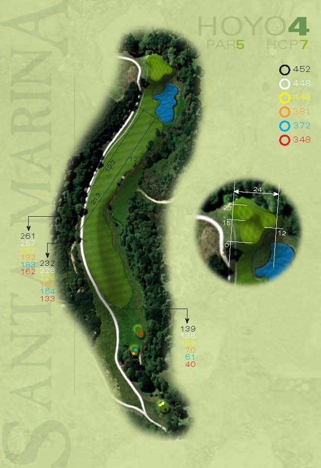 Excelente par 5. Un hoyo muy estratégico donde lo más sensato es ir a colocar la bola en calle en el primer y segundo golpe para atacar el green con un golpe de approach. Un lago en la parte derecha de la calle afecta a la caída del segundo golpe y la entrada a green. Un río recorre toda la parte derecha de la calle.
