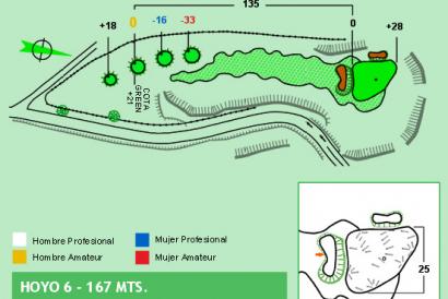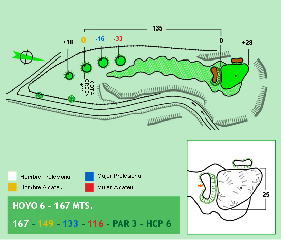 Se trata de un par tres de longitud media construido con el green muy alto en relación a los tees, por lo cual ha de jugarse con más palo del que exige la distancia. Adicionalmente el hoyo presenta por toda su izquierda un fuera de límites muy peligroso y la amenaza de dos bunkers uno al mismo lado y el otro a la entrada, complicando aún más el resultado.