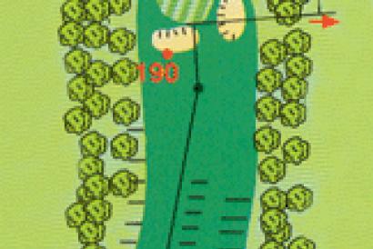 Es un hoyo que cambia mucho según la posición de las barras de salida. Los grandes pegadores, tienen la opción de llegar de un golpe a green, teniendo siempre que salvar los árboles que están a la derecha del tee de rojas.