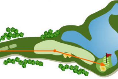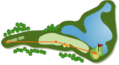 La caída de bola es muy estrecha con agua a la izquierda, y un bunker a la derecha, golpe de precisión y colocación. El segundo golpe al green lo realizamos, a un green defendido por agua a la izquierda, al fondo un bunker a la derecha, y un green con una pendiente pronunciada hacia el lago. Se necesita un golpe de mucha precisión.