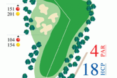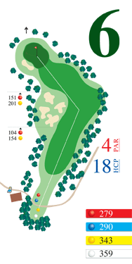 Ligero dog-leg hacia la izquierda. Apoyar la salida hacia la izquierda. Green cuesta abajo.