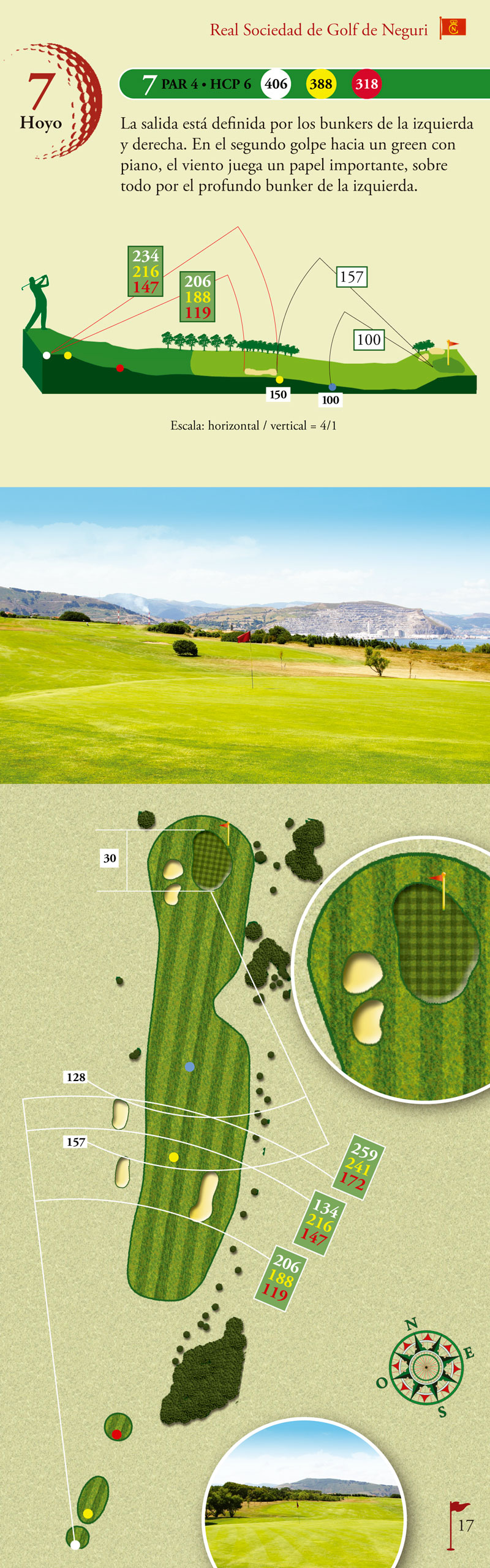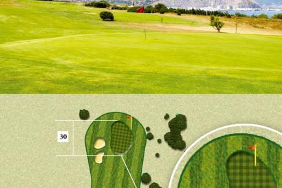 La salida está definida por los bunkers de la izquiera y derecha. En el segundo golpe hacia un green con piano el viento juega un papel importante sobre todo por el profundo bunker de la izquierda.