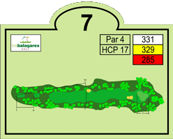 Par cuatro de 331 metros. La única dificultad al golpe de salida es un bunker a 185 metros, a la izquierda de la calle hacia abajo. Para alcanzar el green hay que salvar un bunker frontal y una loma a seis metros de la entrada, como única dificultad.