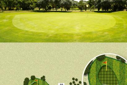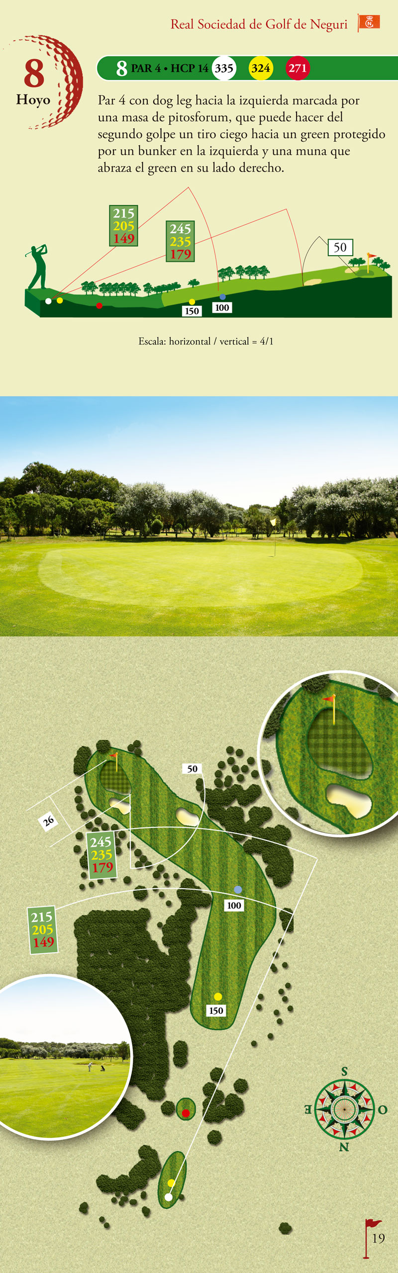 Par 4 con dog leg hacia la izquierda, marcada por una masa de pitosforum, que puede hacer del segundo golpe un tiro ciego hacia un green protegido por un bunker en la izquierda y una muna que abraza el green en su lado derecho.