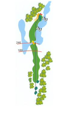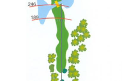 Segundo par cinco de la primera vuelta que tiene en la parte derecha un pinar en crecimiento donde las dificultades principales empiezan en el segundo golpe, ya que tenemos un pequeño riachuelo que cruza la calle comunicando los lagos que se encuentran a derecha e izquierda de la misma. El agua lateral nos acompañará hasta el mismo green que tiene varias ondulaciones que permiten posiciones de bandera interesantes. El bunker de la izquierda proporciona un golpe tenso al ver el agua al otro lado del green.