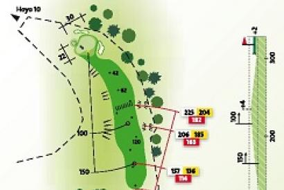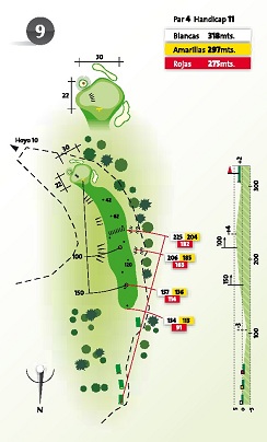 Hoyo ciego con desnivel hacia la derecha. Salida de madera 3 o hierro 1, para un segundo golpe con hierro 8 ó 9.