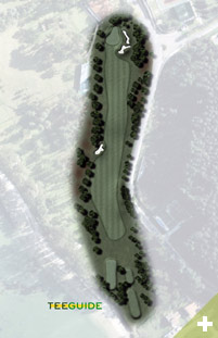 El hoyo 9 es un par 4 corto y recto, con fuera de límites por la derecha y pinos por la izquierda. El green es amplio, protegido por bunkers en el lado derecho.