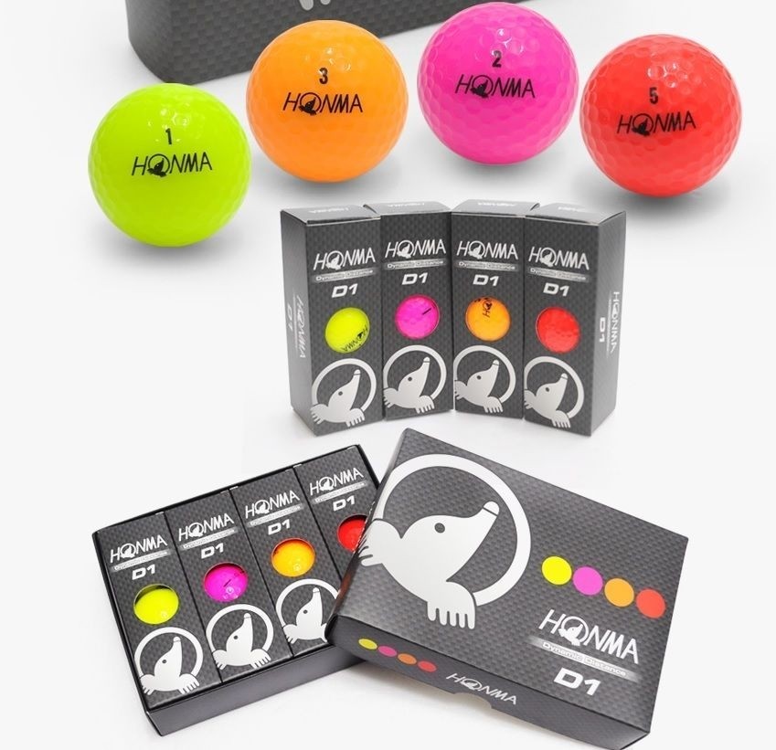 Bolas de Golf Honma D1 Multicolor. La caja lleva doce bolas de cuatro colores diferentes. Bolas de golf de color amarillo, rosa, naranja y rojo. ¡Color en cada golpe!
